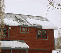 Schneeverlagerungen durch Fehlen von Schneestop. Gefahr für Dach und Dachrinnen. Für Schäden durch Dachlawinen an Mensch und Güter haftet der Hauseigentümer. |